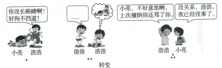 (3)对话内容:浩浩,对不起,我撞倒了你。你好像受伤了,我送你去医务室吧。理由:俊俊同学在撞倒自己后,表现得很有礼貌,并且主动关心,让浩浩回想起自己之前撞倒小亮后的态度很不好。浩浩因此发生了转变,主动向小亮道歉。这件事让浩浩明白了友善待人,会让人有良好的心理体验;需要学会换位思考;做文明有礼的人,还需要言谈文明、举止端庄。