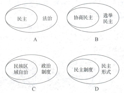 C 本题考查民主等知识。根据所学知识可知,我国政治制度包括人民代表大会制度、基层群众自治制度、民族区域自治制度、中国共产党领导的多党合作和政治协商制度等,C正确;民主与法治不是包含关系,A错误;协商民主和选举民主是我国的两种民主形式,是并列关系,不是包含关系,B错误;民主制度和民主实践是两个不同的概念,不是包含关系,D错误。