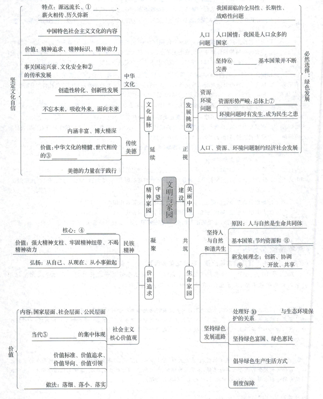 ①博大精深 ②民族精神 ③民族智慧 ④爱国主义 ⑤中国精神 ⑥计划生育 ⑦资源紧缺 ⑧保护环境 ⑨绿色 ⑩经济发展