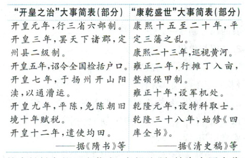 第一步:拟定论题。根据题干中“开皇之治”和“康乾盛世”的相关信息,找出共同点都是中国古代盛世,根据表格中的具体内容,找出共同点是统治者的制度革新,可以拟题如中国古代盛世之下统治者的制度革新等。