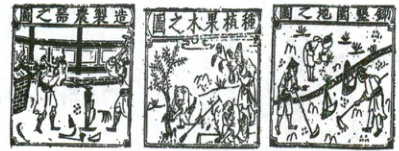 例154 [河北2023·5]明代《新刻天下四民便览三台万用正宗》中载有描绘农具制作、果木种植嫁接、蔬菜移栽等场景的全新耕织图(如图)。
