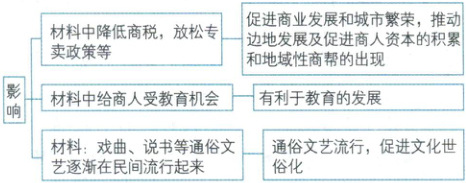 (2)影响:促进商业发展和城市繁荣;推动边地发展;有利于教育的发展,促进商人资本的积累和地域性商帮的出现;通俗文艺流行,促进文化世俗化。