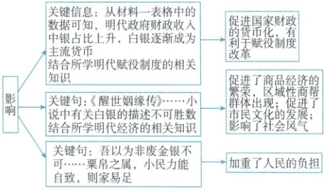 (2)影响:建议从白银货币化对国家财政、赋役制度改革,社会商品经济的发展、市民文化和社会风气,以及对人民的影响等几个角度进行分析。