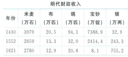 (1)材料一是明代国家财政收入的官方统计数据,可用于研究明代白银货币化的原因、表现等问题。