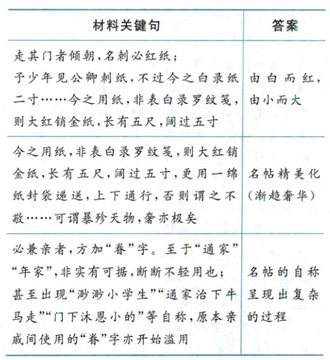 (2)原因:根据材料“宦官刘瑾受宠用事,‘走其门者倾朝,名刺必红纸’”“明朝中期以后,士大夫交际活动日益活跃”可知,官场交往的需求(士大夫交际活动增加);根据材料“可谓暴殄天物,奢亦极矣”及所学明朝的时代特点可知,官场风气奢侈腐化,商品经济的发展;根据材料“‘视其爵、齿及交谊以为斟酌’的风气日盛,衍生出‘晚生’‘侍生’,甚至出现‘渺渺小学生’‘通家治下牛马走’‘门下沐恩小的’等自称,原本亲戚间使用的‘眷’字亦开始滥用”并结合所学可知,等级观念和宗法观念的影响;根据所学明中后期的社会风尚的变化可知,社会风尚和礼仪规范的变化。