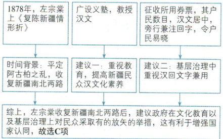【解析】本题考查左宗棠收复新疆后的民族交融政策。材料强调文字使用,属于文化教育领域,税收改革属于经济领域,排除A项;左宗棠是从维护国家统一角度提出在新疆地区使用汉文字,改进教育方法、引导社会风尚的角度过于微观和具体,并非这一建议的主要目的所在,排除B、D两项。