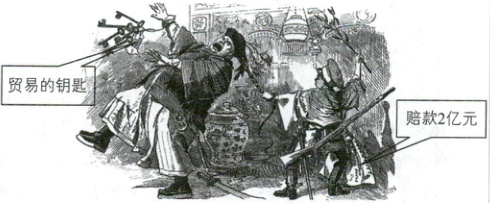 例206 [重庆新高考]《马关条约》换约前夕,英国某画报刊登了一幅漫画(如下图),又附评论称:“中国,如果完全开放,对人类而言将是个黄金……战争影响下的真正占领是对市场权力的占领,显然规模很大。”这些信息反映出(