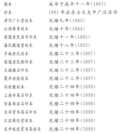 (2)从表2中看得出该书成书于1861年,成书后抄本在士大夫中广泛流传,但短期内并没有正式刊刻出版,说明书中学习西方以改革自强的主张超前于作者所处的时代和社会,并没有付诸实践。19世纪80年代,随着民族危机的加深和洋务运动的推动,该书逐渐有了民间刊刻版本,说明洋务运动推动了中国近代化进程,向西方学习的主张更容易被接受。1895年后该书广泛刊印并流行,这反映了在民族危机空前严重的背景下,中国人学习西方逐渐从器物层面上升到制度和文化层面,资产阶级维新派登上政治舞台,开展了维新变法运动,维新变法的内容深受该书的影响,故该书在19世纪90年代大量刊印并发行,一定程度上指导了维新变法运动并促进了民众的思想解放和社会转型。该书大规模刊刻印刷要到成书三十多年后,从侧面反映了近代思想解放的阻力之大。
