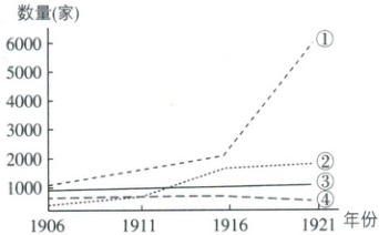 下图为1906—1921年日、英、德、俄四国在华商号数量变化示意图。其中①是(