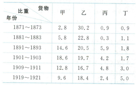 下表为1871~1921年中国进口的棉布、棉纱、钢铁、米等四类货物在进口总值中的占比(%)情况。其中甲是(
