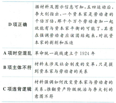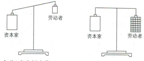 例253 [河北2024·9]1923年12月,李大钊在一次演讲中说“一个劳动者不过是一个资本家的千分之一,万分之一……百个劳动者不及一个资本家,那可加到千个,倘使能够再加到万个,终有平衡的可能了”,并展示了如下示意图。