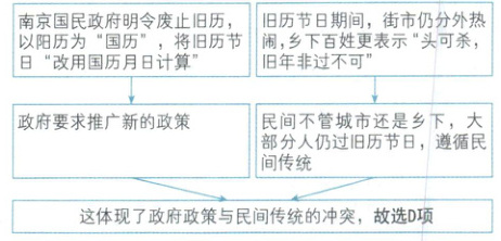 【解析】本题考查南京国民政府时期社会生活的变迁。旧历节日不等同于落后的迷信观念,故排除 A 项;题干表明阳历节日只有机关学校“遵依中央,放假休憩”,街市的人们与乡下百姓大部分仍然坚守过旧历节日,故这不是城市新风与乡村旧俗的对立,排除 B 项;阳历不能完全等同于工业文明,同样旧历也不能完全等同于农耕社会,排除 C 项。