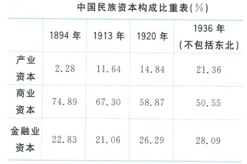 【解析】本题考查近代民族工业。根据表格可知 1894—1936 年中国商业资本所占比重是在不断下降的,而金融业资本以及产业资本所占比重总体呈上升趋势,尤其是产业资本所占比重上升幅度较快,说明这一时期我国的民族工业有所发展,故选 A 项;材料体现了商业资本的比重下降,并不等同于商业贸易萎缩,如贸易总额可能增加,但是相较于产业资本以及金融业资本来讲总量较少导致所占比重下降而已,排除 B 项;材料中金融业资本所占比重总体上升,但不等于金融体系臻于完善,排除 C 项;材料反映的是不同的资本类型所占比重的变化,没有反映农业、工业和商业三者之间的比例关系,排除 D 项。