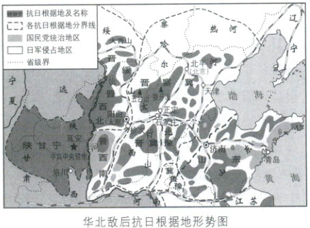 (2)第一小问分布特征,根据材料地图所示,华北敌后抗日根据地数量多,分布广,主要在日军侵占地区和国统区,彼此犬牙交错;观察地图及根据地的名称可知在几省交界的山区农村;地图西边是陕甘宁根据地,为当时中共中央所在地,结合地图可知华北敌后抗日根据地离中共中央驻地较近;从地图中可见铁路纵横,说明这里战略地位重要,又是沟通东北与华中的中间地带,所以分布在战略要地,阻滞南北日军汇合。第二小问原因,根据材料并结合所学可知,抗日战争时期八路军兵力不足且武器装备落后,正面与敌较量不占优势,但可以利用地形优势和广泛动员群众参与,变被动为主动,以空间换时间。采取具有主动性、灵活性、进攻性、速决性等为特点的游击战合理分配兵力,合理选择作战时机,从而取得战争胜利。