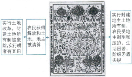 【解析】本题考查土地改革。据材料中的文字和图示信息可知,时间是“新民主主义革命时期”,据信息“农民翻身,清算粮户家底,砍倒大树,分地分房分财宝”可知材料反映的历史事件是解放战争时期的土地改革,这一改革实现了耕者有其田,故选A项;据材料内容推断该时期为解放战争时期,排除B项;废除土地私有制是在社会主义改造时期,与年画反映的时间不符,排除C项;材料反映的是废除封建地主土地所有制,而配合抗日民主政权建设是在抗战时期,这一时期未涉及土地制度的根本变革,排除D项。
