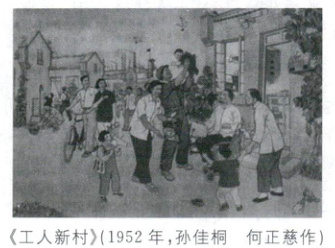 《工人新村》为1952年孙佳桐、何正慈创作之宣传画,展现工人们新村生活场景。