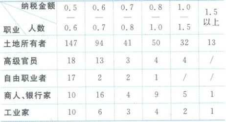 【解析】本题考查法国工业革命。1840年处于第一次工业革命时期,从法国最高纳税人职业表中可见,纳税高的职业以土地所有者为主,工业家人数并不多,说明法国此时工业发展程度有限,故选B项;材料并未表明阶层间流动问题,所以看不出社会阶层固化,排除A项;材料只体现1840年纳税情况,并没有之前或之后的数据,没法比较,所以不能说贫富差距扩大,排除C项;材料只给了纳税的金额,并未给出收入额,所以无法确定纳税的比例,也无法得出税收负担是否沉重,排除D项。