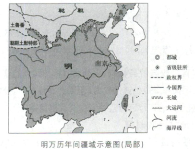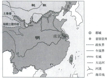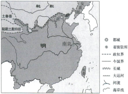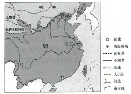 根据上图并结合所学知识,在答题卡的地图中标示出明代卫所集中分布的区域,并说明集中分布的理由。(要求:只需标示出明代卫所的一个集中分布区域;在答题卡的地图中用斜线//////明确标示,理由准确充分,表述清晰。)