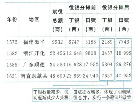 根据表格信息可知役银分摊后,田赋比例高于丁银,结合所学可知明朝实行一条鞭法的赋税改革,将部分丁役负担摊入田亩,有利于减轻农民的人头税负担,改变了过去隐瞒人口等现象,从而刺激人口增长,故B项正确;丁银在分摊后减少,排除A项;役银分摊后,封建的人身依附关系减弱,有利于促进商业发展,排除C、D两项。