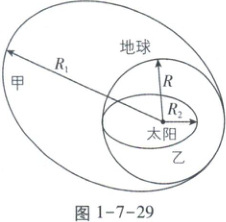 例176 [浙江2024年6月·8]与地球公转轨道“外切”的小行星甲和“内切”的小行星乙的公转轨道如图1-7-29所示,假设这些小行星与地球的公转轨道都在同一平面内,地球的公转半径为R,小行星甲的远日点到太阳的距离为R_1,小行星乙的近日点到太阳的距离为R_2,则(
