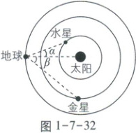 例181 [辽宁新高考]如图1-7-32所示,行星绕太阳的公转可以看作匀速圆周运动,在地面上容易测得地球—水星连线与地球—太阳连线夹角$\alpha$,地球—金星连线与地球—太阳连线夹角$\beta$。两角最大值分别为$\alpha_{m}$、$\beta_{m}$,则(