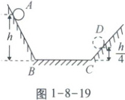 例 200 如图 1 - 8 - 19 所示,质量为 $ m $ 的小球从斜面上距水平面高度为 $ h $ 处的 $ A $ 点滚下,经过水平面 $ BC $ 后,再滚上另一斜面,当它到达距水平面高度为 $ \dfrac{h}{4} $ 的 $ D $ 点时,速度为零。重力加速度为 $ g $,在这个过程中,重力做功为( )