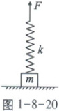 例 201 如图 1 - 8 - 20 所示,质量为 $ m $ 的物体静止在地面上,物体上面连着一个直立的轻质弹簧,弹簧的劲度系数为 $ k $。现用手拉住弹簧上端,将弹簧上端缓慢提升高度 $ h $,此时物体已经离开地面,已知重力加速度为 $ g $,求物体重力势能的增加量。