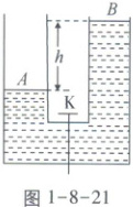 例 202 如图 1 - 8 - 21 所示,有一连通器,$ A $、$ B $ 两管的横截面积均为 $ S $,内盛密度为 $ \rho $ 的液体,开始时两管内的液面高度差为 $ h $。若打开底部中央的阀门 $ K $,液体开始流动,最终左右液面相平,重力加速度为 $ g $。在这一过程中,液体的重力势能变化了多少?是增加了还是减少了?如果是减少了,减少的重力势能转化为什么能?