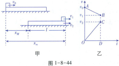 【解析】作出木板及物块的运动草图, 如图 1 - 8 - 44 甲所示, 根据木板和物块的运动情况可以作出其 $ v - t $ 图像如图 1 - 8 - 44 乙所示. 木板受到的摩擦力向右, 摩擦力对木板做正功, 设木板对地位移为 $ x_{M} $, 对木板, 由动能定理得 $ fx_{M} = \frac{1}{2}Mv_{2}^{2} $, $ v - t $ 图像中图线与坐标轴围成图形的面积表示位移, 可知 $ x_{M} < l $, 则木板的末动能一定小于 $ fl $, A 错误, B 正确; 物块受到的摩擦力向左, 摩擦力对物块做负功, 由运动草图可知, 物块的对地位移为 $ x_{M} + l $, 对物块, 由动能定理得 $ -f(x_{M} + l) = \frac{1}{2}mv_{1}^{2} - \frac{1}{2}mv_{0}^{2} $, 物块的末动能为 $ \frac{1}{2}mv_{1}^{2} = \frac{1}{2}mv_{0}^{2} - f(x_{M} + l) < \frac{1}{2}mv_{0}^{2} - fl $, C 错误, D 正确.