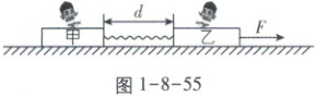 [山东2024·7]如图 1 - 8 - 55 所示, 质量均为 $ m $ 的甲、乙两同学, 分别坐在水平放置的轻木板上, 木板通过一根原长为 $ l $ 的轻质弹性绳连接, 连接点等高且间距为 $ d(d < l) $. 两木板与地面间动摩擦因数均为 $ \mu $, 弹性绳劲度系数为 $ k $, 被拉伸时弹性势能 $ E = \frac{1}{2}kx^{2} $ ($ x $ 为绳的伸长量). 现用水平力 $ F $ 缓慢拉动乙所坐木板, 直至甲所坐木板刚要离开原位置, 此过程中两人与所坐木板保持相对静止, $ k $ 保持不变, 最大静摩擦力等于滑动摩擦力, 重力加速度大小为 $ g $, 则 $ F $ 所做的功等于 ( )