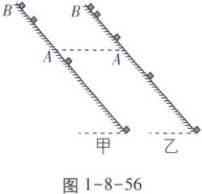 [江苏2023·11]滑块以一定的初速度沿粗糙斜面从底端上滑, 到达最高点 $ B $ 后返回到底端. 利用频闪仪分别对上滑和下滑过程进行拍摄, 频闪照片示意图如图 1 - 8 - 56 所示. 与图 1 - 8 - 56 乙中相比, 图 1 - 8 - 56 甲中滑块 (