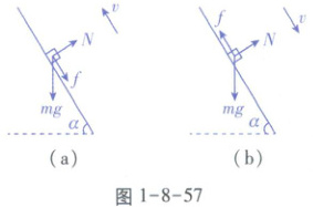 【解析】对滑块上滑、下滑过程受力分析, 如图 1 - 8 - 57(a)、(b) 所示, 由牛顿第二定律可得, 上滑阶段有 $ F_{合1} = mg\sin\alpha + f = ma_{1} $, 下滑阶段有 $ F_{合2} = mg\sin\alpha - f = ma_{2} $, 则 $ F_{合1} > F_{合2} $, $ a_{1} > a_{2} $, 由 $ x = \frac{1}{2}at^{2} $ 可知, 滑块上滑过程的时间小于下滑过程的时间, 根据频闪仪每隔相等时间拍下一个影像可知, 图 1 - 8 - 56 甲为上滑过程, 图 1 - 8 - 56 乙为下滑过程, A 错误; 在同一高度处, 由能量守恒定律和摩擦力做功可知, 上滑时的动能较大, B 错误; $ A $、$ B $ 之间距离大小相等, 上滑过程的平均速度较大, 用时较短, C 正确; 由 $ W_{f} = fx $ 可知, 上滑和下滑过程在 $ A $、$ B $ 之间克服摩擦力做的功一样多, D 错误.