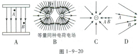 )【解析】电场线的疏密表示场强的大小,电场线上该点的切线方向表示该点的场强方向。A中电场为匀强电场,则A、B两点电场强度相同,故A正确;B中A、B两点电场强度大小、方向均不相同,故B错误;C中A、B两点电场强度大小不相等,方向相同,故C错误;D中A、B两点电场强度大小、方向均不相同,故D错误。