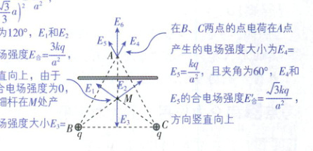 在B、C两点的点电荷在M点产生的电场强度大小为$ E_{1} = E_{2} = \frac{kq}{(\frac{\sqrt{3}}{3}a)^{2}} = \frac{3kq}{a^{2}} $,且夹角为$ 120^{\circ} $,$ E_{1} 和 E_{2} 的合电场强度 E_{0} = \frac{3kq}{a^{2}} $,方向竖直向上,由于M点处合电场强度为0,则带电细杆在M处产生的电场强度大小$ E_{3} = \frac{3kq}{a^{2}} $,方向竖直向下。