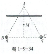 如图1-9-34,真空中有两个电荷量均为$ q(q > 0) $的点电荷,分别固定在正三角形ABC的顶点B、C。M为三角形ABC的中心,沿AM的中垂线对称放置一根与三角形共面的均匀带电细杆,电荷量为$ \frac{q}{2} $。已知正三角形ABC的边长为a,M点的电场强度为0,静电力常量为k。顶点A处的电场强度大小为(