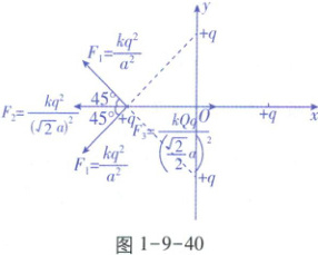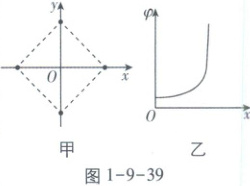 【解析】由图1-9-39乙可知,在$ 0 \leq x < \frac{\sqrt{2}}{2}a $区间内沿x轴正方向电势升高,则场强方向沿x轴负方向,故电荷量为-Q的点电荷P受到的电场力方向向右,P将沿x轴向右运动;若P置于O点,每个点电荷所受库仑力的合力均为零,对左侧点电荷受力分析,如图1-9-40所示,由平衡条件可得$ 2 \frac{kq^{2}}{a^{2}} \cos 45^{\circ} + \frac{kq^{2}}{(\sqrt{2}a)^{2}} = \frac{kQq}{(\frac{\sqrt{2}}{2}a)^{2}} $,解得$ Q = \frac{2\sqrt{2} + 1}{4}q $,C正确。