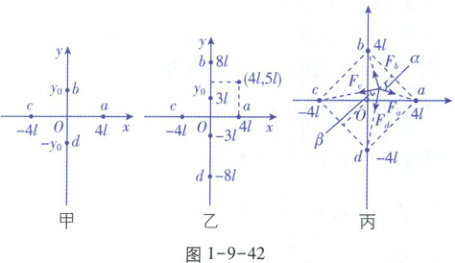 【解析】将四个点电荷分别编号为a、b、c、d,如图1-9-42甲所示,在菱形外第一象限取一点,a、b两点电荷合场强方向斜向右上,c、d两点电荷合场强方向也斜向右上,总场强一定不为零,且方向斜向右上,同理第二、三、四象限内菱形外各点场强也不为零,故A正确;原点O场强为零,除此点外,若菱形内有一点场强为零,则必有和此点关于原点对称的一点场强为零,则场强为零的点不可能为两个,故B错误;如图1-9-42乙所示,$ (0, -3l) 点与 (0, 3l) $点电势相同,且$ (0, 3l) 与 (4l, 5l) $两点到a、b两点电荷的距离相同,则a、b两点电荷对试探电荷做功为零,c、d两点电荷对试探电荷均做正功,故C正确;作出$ (l, l) $点处负试探电荷所受四个静电力如图1-9-42丙所示,由几何知识可知$ \cos \alpha = \sqrt{\frac{1}{5}} $,$ \cos \beta = \sqrt{\frac{9}{13}} $,c、d两点电荷到试探电荷的距离$ r_{2} = \sqrt{26}l $,a、b两点电荷到试探电荷的距离$ r_{1} = \sqrt{10}l $,计算有$ 2k \frac{Qq}{r_{1}^{2}} \cos \alpha - 2k \frac{Qq}{r_{2}^{2}} \cos \beta > 0 $,可知$ (l, l) $处负试探电荷所受静电力合力与x轴正方向成$ 45^{\circ} $斜向上,故D正确。