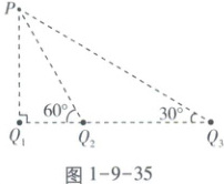 如图1-9-35,真空中有三个点电荷固定在同一直线上,电荷量分别为$ Q_{1} $、$ Q_{2} 和 Q_{3} $,P点和三个点电荷的连线与点电荷所在直线的夹角分别为$ 90^{\circ} $、$ 60^{\circ} 和 30^{\circ} $。若P点处的电场强度为零,$ q > 0 $,则三个点电荷的电荷量可能为( )