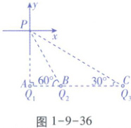 【解析】以P点为坐标原点,AP方向为y轴正方向,垂直y轴向右为x轴正方向,建立直角坐标系,如图1-9-36所示,根据矢量合成和几何关系可知,$ Q_{1} 和 Q_{3} $电性相同,且与$ Q_{2} $电性相反,才可以保证P点处电场强度为零,A、B错误;设PA的长度为d,则$ PB = \frac{2\sqrt{3}}{3}d $,$ PC = 2d $,根据正交分解可知,在x轴方向上有$ \frac{k|Q_{3}|}{(2d)^{2}} \cdot \cos 30^{\circ} = \frac{k|Q_{2}|}{(\frac{2\sqrt{3}}{3}d)^{2}} \cdot \cos 60^{\circ} $,在y轴方向有$ \frac{k|Q_{1}|}{d^{2}} + \frac{k|Q_{3}|}{(2d)^{2}} \cdot \sin 30^{\circ} = \frac{k|Q_{2}|}{(\frac{2\sqrt{3}}{3}d)^{2}} \cdot \sin 60^{\circ} $,联立解得$ |Q_{2}| = \frac{4\sqrt{3}}{3}|Q_{1}| $,$ |Q_{3}| = 4|Q_{1}| $,若$ Q_{1} = q $,则$ Q_{2} = -\frac{4\sqrt{3}}{3}q $,$ Q_{3} = 4q $,若$ Q_{1} = -q $,则$ Q_{2} = \frac{4\sqrt{3}}{3}q $,$ Q_{3} = -4q $,C错误,D正确。