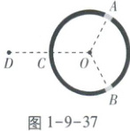 半径为R的绝缘细圆环固定在图1-9-37所示位置,圆心位于O点,环上均匀分布着电荷量为Q的正电荷。点A、B、C将圆环三等分,取走A、B处两段弧长均为$ \Delta L $的小圆弧上的电荷。将一点电荷q置于OC延长线上距O点为2R的D点,O点的电场强度刚好为零。圆环上剩余电荷分布不变,q为(
