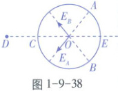 【解析】若将A、B处电荷补上,由对称性可知,关于O点对称的两点处的电荷在O处产生的场强大小相等,方向相反,故O处场强为零,现取走A、B两处电荷,则圆环上剩余电荷在O处产生的场强与取走的A、B处的电荷在O处产生的合场强大小相等,方向相反。圆环上电荷均匀分布,则A、B处取走的电荷量均为$ q' = \frac{Q \cdot \Delta L}{2\pi R} $,则$ E_{A} = E_{B} = \frac{kq'}{R^{2}} $,如图1-9-38所示,取走的电荷在O处产生的合场强大小为$ E_{AB} = 2 \cdot \frac{kq'}{R^{2}} \cdot \cos 60^{\circ} $,方向水平向左。因为D点的点电荷q和圆环上剩余电荷在O处产生的合场强为零,故点电荷q在O处产生的场强大小和方向与$ E_{AB} $相同,则有$ \frac{kq}{(2R)^{2}} = E_{AB} $,联立解得$ q = \frac{2Q\Delta L}{\pi R} $,为负电荷,C正确。