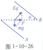 例268 如图1-10-25所示,一平行板电容器板长$L = 4$cm,板间距离$d = 3$cm,倾斜放置,使板面与水平方向的夹角$\alpha = 37°$,若两板间所加电压$U = 100$V,一带电荷量大小为$q = 3.0×10^{-10}$C的粒子以$v_0 = 0.5$m/s的速度自A板左边缘水平进入电场,在电场中沿水平方向运动,并恰好从B板右边缘水平飞出,则带电粒子从电场中飞出时的速度大小是多少?带电粒子的质量是多少?(已知$\sin\alpha = 0.6$,$\cos\alpha = 0.8$,重力加速度g取10m/s^2)