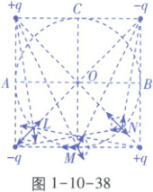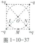 例277 [全国高考]如图1-10-37,两对等量异号点电荷$+q$、$-q(q>0)$固定于正方形的4个顶点上. $L$、$N$是该正方形两条对角线与其内切圆的交点,$O$为内切圆的圆心,$M$为切点. 则( )