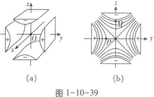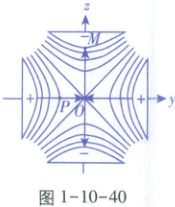 【解析】根据图1-10-39(b),可知中心点到四极杆的距离相同,所以中心点处的电势与无穷远处相等(设为零电势面),则$x$轴是电势为零的等势线,根据正(负)电荷聚集附近电势高(低)和电场线与等势线垂直可作出部分电场线如图1-10-40所示. 沿电场线方向电势降低,故$P点电势高于O$点电势,$O点电势高于M$点电势,故$P点电势高于M$点电势,A错误;由等差等势面越密电场强度越大知,$P点电场强度大小小于M$点电场强度大小,B错误;由图1-10-40知$M点电场强度方向沿z$轴正方向,C正确;$x$轴为等势线,故沿$x$轴运动的带电粒子电势能不变,D正确.