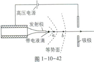例280 [广东新高考]图1-10-42是某种静电推进装置的原理图,发射极与吸极接在高压电源两端,两极间产生强电场,虚线为等势面. 在强电场作用下,一带电液滴从发射极加速飞向吸极. $a$、$b$是其路径上的两点,不计液滴重力,下列说法正确的是(