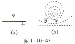 例281 [全国高考]如图1-10-43(a),在一块很大的接地金属平板的上方固定一负电荷. 由于静电感应,在金属平板上表面产生感应电荷,金属板上方电场的等势面如图1-10-43(b)中虚线所示,相邻等势面间的电势差都相等. 若将一正试探电荷先后放于$M和N$处,该试探电荷受到的电场力大小分别为$F_M和F_N$,相应的电势能分别为$E_{pM}和E_{pN}$,则(