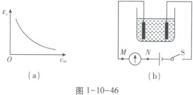 例284 [黑吉辽2024·5]某种不导电溶液的相对介电常数$\varepsilon_r与浓度c_m$的关系曲线如图1-10-46(a)所示. 将平行板电容器的两极板全部插入该溶液中,并与恒压电源、电流表等构成如图1-10-46(b)所示的电路. 闭合开关$S$后,若降低溶液浓度,则(