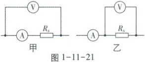 例300 用电流表和电压表测量电阻 $ R_{x} $ 的阻值,分别将图 1 - 11 - 21 甲和图 1 - 11 - 21 乙两种测量电路连接到电路中。将图 1 - 11 - 21 甲连接到电路中时,电流表示数为 $ 4.60 \, mA $,电压表示数为 $ 2.50 \, V $;将图 1 - 11 - 21 乙连接到电路中时,电流表示数为 $ 5.00 \, mA $,电压表示数为 $ 2.45 \, V $。比较这两次结果,下列说法正确的是( )