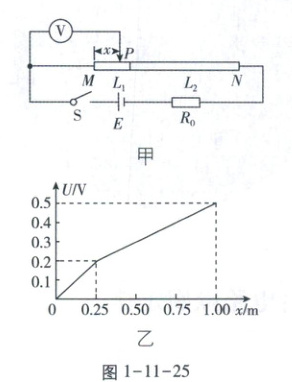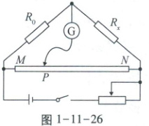 例306 [安徽高考]用图1-11-26所示的电路可以测量电阻的阻值. 图中R_x是待测电阻, R₀是定值电阻, G是灵敏度很高的电流表, MN是一段均匀的电阻丝. 闭合开关, 改变滑动头P的位置, 当通过电流表G的电流为零时, 测得MP = l_1, PN = l_2, 则R_x的阻值为(
