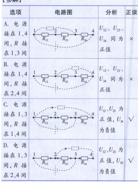 | D. 电源接在1、3间,R接在1、4间 | | $U_{12}$、$U_{23}$为正值,$U_{34}$为负值 |